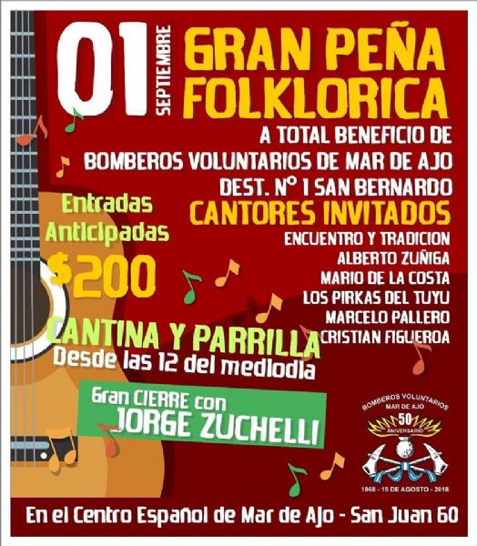 El próximo domingo 1 de septiembre, a partir de las 12.00, se vivirá una gran peña folclórica, a beneficio de Bomberos Voluntarios Mar de Ajó y el Destacamento N°1 de San Bernardo.