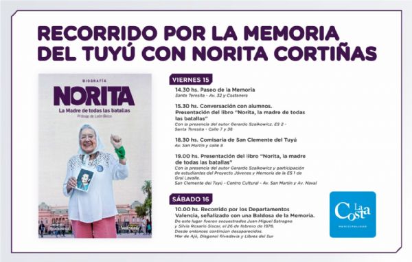 La propuesta organizada por la Municipalidad de La Costa comenzará mañana viernes 15, a las 14.30 en el Paseo de la Memoria Santa Teresita, ubicado en Avenida 32 y Costanera. A las 15.30, en la Escuela Secundaria N° 2 de Santa Teresita –calle 7 y 38- habrá una charla con los alumnos y se presentará el libro “Norita, la madre de todas las batallas”, con la presencia del autor Gerardo Szalkowicz.