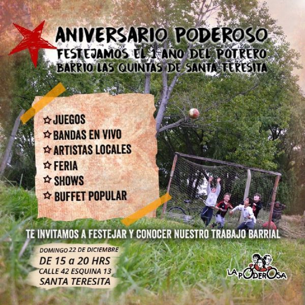 El Potrero barrio Las Quintas cumple su 1° año y quiere invitar a toda la comunidad a su festejo el próximo domingo 22/12 desde las 15 hs en Calle 42 y esquina 13 de Santa Teresita.