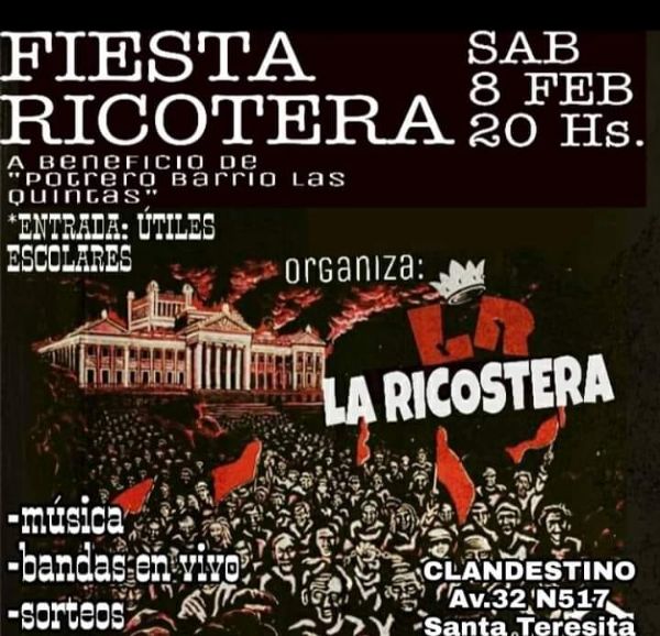 "La Ricostera" organizan este evento, que además de reunir su pasión por Patricio Rey y sus redonditos de ricota, también tuvieron el enorme gesto de que la entrada sea un útil escolar que será destinado a los pibes de "El potrero Barrio Las Quintas" para acompañarlos en un nuevo inicio escolar.
