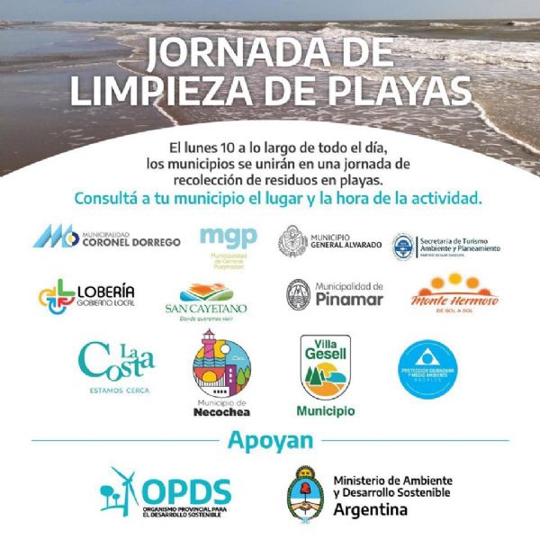Durante el Lunes 10 de Febrero estaremos realizando, en diferentes puntos de nuestro Partido de La Costa, una jornada de limpieza de playas y cuidado del Medio Ambiente.