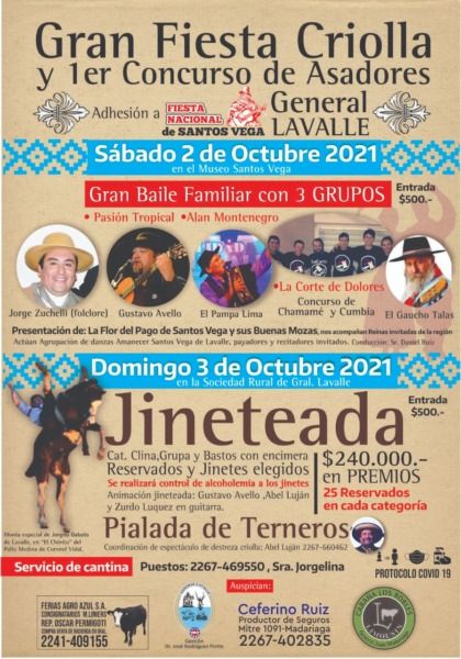 Entre el sábado 2 y el domingo 3 de octubre, se llevará a cabo en General Lavalle una Gran Fiesta Criolla con baile familiar, jineteada, pialada de terneros y shows musicales.