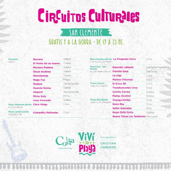 Humor, circo, música y títeres son algunas de las propuestas que se podrán disfrutar en los Circuitos Culturales dispuestos por la Municipalidad de La Costa en las plazas y peatonales de las distintas localidades.