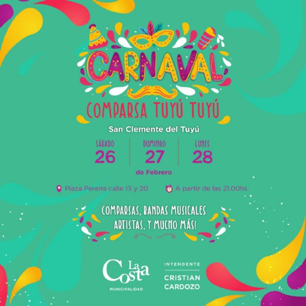 Desde el sábado 26 hasta el lunes 28 la Comparsa Tuyú Tuyú invitará a disfrutar de los carnavales en la Plaza Pereira de San Clemente. Todas las noches a partir de las 21.00 comenzarán a desfilar las comparsas y a presentarse las distintas bandas y artistas que participarán del evento familiar.
