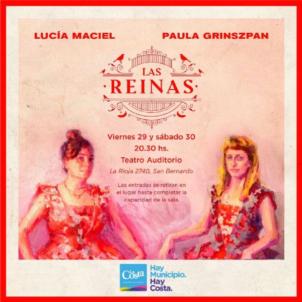 El viernes 29 y el sábado 30 a las 20.30, en el Teatro Auditorio de San Bernardo, se podrán disfrutar funciones de “Las Reinas” con entrada gratuita. Se trata de una obra protagonizada por Paula Grinszpan y Lucía Maciel que se presentó con gran éxito en el teatro independiente porteño.