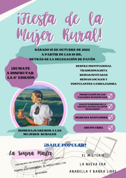 El próximo 15 de octubre de 2022 se llevará a cabo la 6° Edición de la Fiesta de la Mujer Rural a partir de las 10:00 horas.