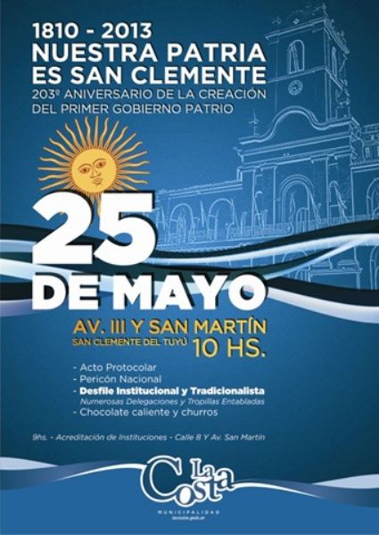 La Municipalidad de La Costa invita a la comunidad a participar del acto y desfile institucional y tradicionalista que se realizará con motivo del 203° Aniversario de la Creación del Primer Gobierno Patrio.