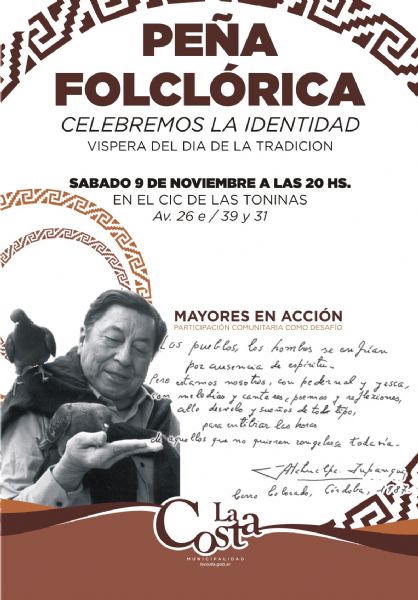 La Municipalidad del Partido de La Costa a través de su Secretaría de Desarrollo informa que el sábado 9 de noviembre, en vísperas del día de la tradición, la Dirección de Integración de Adultos Mayores realizará la peña folclórica Celebrando la identidad.