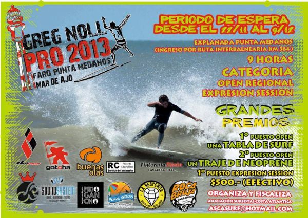 A.S.C.A Informa que el campeonato de surf Greg Noll Pro 2013 dará inicio este próximo día viernes 6 de Diciembre en playas de Punta Medanos, las condiciones de olas presentan un pronostico muy interesante con swell del sector sur sureste y viento off shore suave durante todo el día, el periodo de olas es de 14 segundos con un tamaño de 1.10 metros.