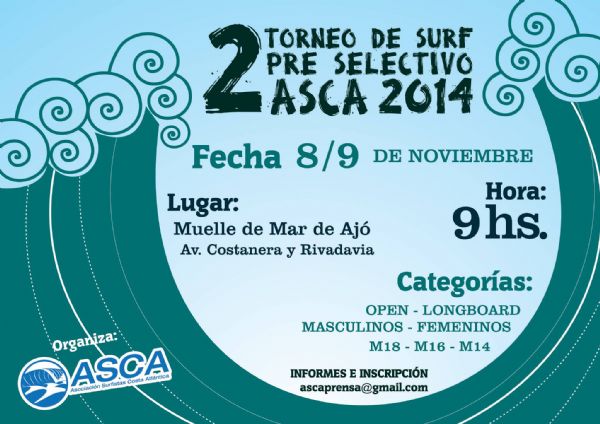 Prensa ASCA informa que se viene el segundo torneo de surf preselectivo organizado por la Asociacion Surfistas Costa Atlantica, el mismo tiene como objetivo preseleccionar 9 jovenes surfistas que formaran parte del equipo oficial ASCA, el cual representara al partido de la costa en el próximo Torneo Nacional de Surf por equipos que organiza la Asociacion de Surf Argentina (ASA) .