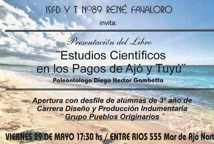 El Viernes 29 de Mayo, el paleontólogo Diego Héctor Gambetta presentará su libro “Estudios científico en los pagos de Ajó y Tuyú” en el ISFDyT Nº89 René Favaloro.