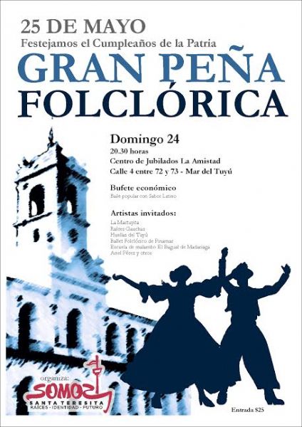 Con motivo de celebrar el cumpleaños de la patria, el domingo 24 de mayo la asociación civil SOMOS Santa Teresita realizará una peña folclórica.