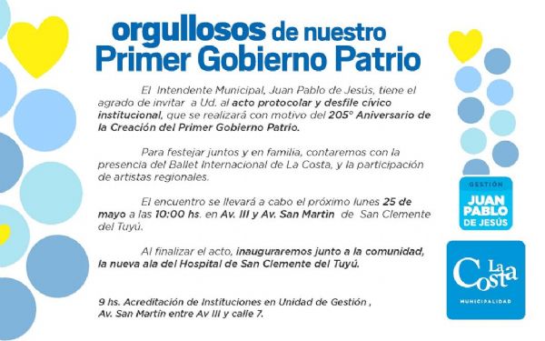 La Municipalidad de La Costa invita a la comunidad a celebrar el 205° aniversario de la creación del Primer Gobierno Patrio, el lunes 25 de mayo en San Clemente del Tuyú.