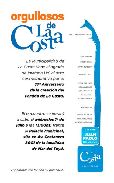 La Municipalidad de La Costa invita a la comunidad a participar el acto conmemorativo por el 37° aniversario de la creación del Partido de La Costa.