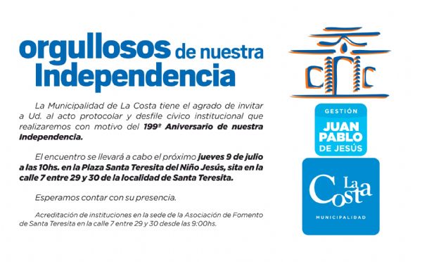La Municipalidad de La Costa invita a la comunidad al acto protocolar y desfile cívico institucional que se realizará con motivo de festejar el 199 aniversario de nuestra Independencia.