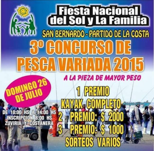 Organizado por la Comisión de la Fiesta Nacional del Sol y la Familia de San Bernardo, el próximo domingo 26 de julio se realizará el 3° Concurso de Pesca Variada a la pieza de mayor peso.