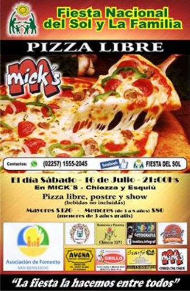 En el evento se podrá disfrutar de pizza libre, con entrada y postre más bebidas, y todo lo recaudado se destinará a la organización de la próxima edición de la Fiesta Nacional del Sol y la Familia, que se realiza en diciembre con la participación de artistas locales, regionales y nacionales.