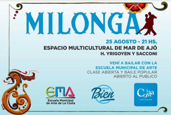 Este viernes 25 de agosto a las 21.00 se realizará en el Espacio Multicultural de Mar de Ajó (Yrigoyen y Sacconi) una clase abierta de tango y milonga organizada por la Escuela Municipal de Arte (EMA).