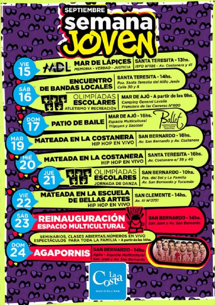 La Municipalidad de La Costa organizó una serie de propuestas recreativas y artísticas que comenzarán este viernes 15 y se extenderán hasta el domingo 24 por la Semana Joven, tal el nombre de la iniciativa que por tercer año consecutivo homenajea a los jóvenes y su lucha por los derechos con actividades pensadas especialmente para ellos.