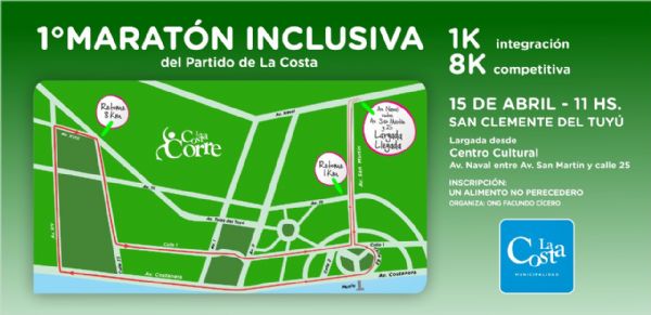 El domingo 15 desde las 11.00 se realizará la primera edición de la maratón inclusiva “Corremos todos juntos”, con largada desde el Centro Cultural de San Clemente, en Av. Naval y Av. San Martín.