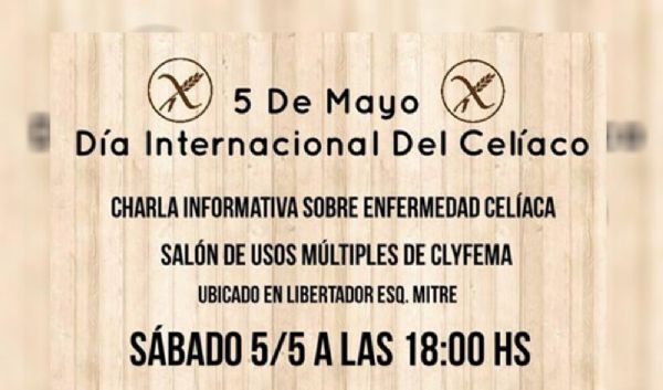 El sábado 5 de mayo, a las 18.00, se llevará a cabo una charla informativa en el marco del Día Internacional del Celíaco, en el Salón de Usos Múltiples de Clyfema, ubicado en Avenida Libertador esquina Mitre.
