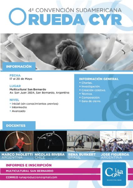 En el Espacio Multicultural de San Bernardo se realizará, desde este jueves 17 hasta el domingo 20, la 4ª Convención Sudamericana de Rueda Cyr. El evento, que reúne a educadores y alumnos de la disciplina circense, brindará charlas y prácticas con destacados artistas de América del Sur.