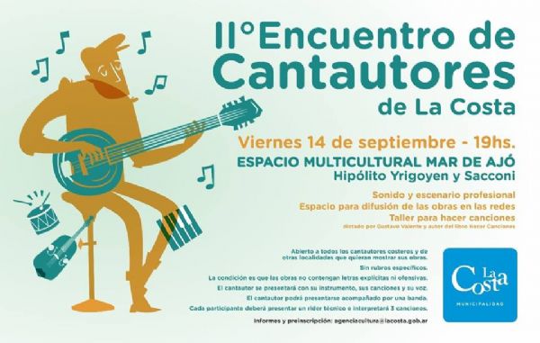 La Municipalidad de La Costa informa que el viernes 14 de septiembre a las 19.00 se llevará a cabo el 2° Encuentro de Cantautores de La Costa, en el Espacio Multicultural Mar de Ajó, ubicado en Yrigoyen y Sacconi.