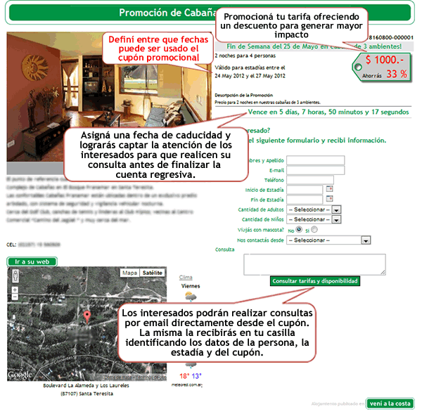 Los cupones de Tarifas y Promociones son una herramienta adicional para quienes poseen el Plan Destacado mediante la cual podrás incrementar la cantidad de consultas sobre disponibilidad.